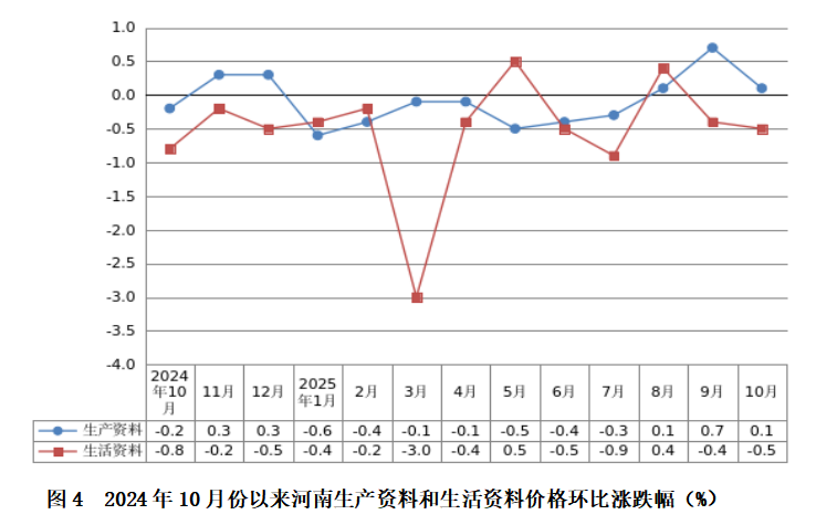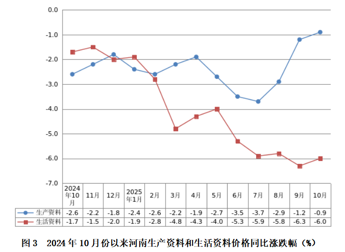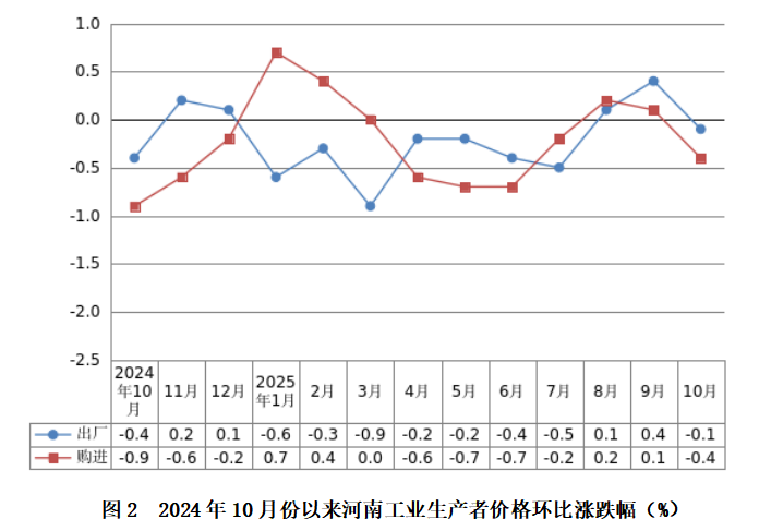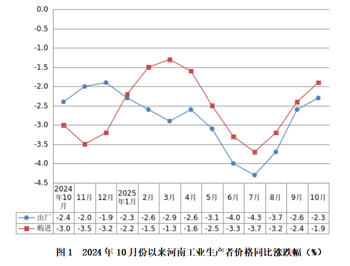 2025年10月份,河南工业生产者出厂价格同比下降2.3%,降幅较上月收窄0.3个百分点;环比由上月上涨0.4%转为下降0.1%。工业生产者购进价格同比下降1.9%,降幅较上月收窄0.5个百分点;环比由上月上涨0.1%转为下降0.4%。1—10月平均,工业生产者出厂价格同比下降3.1%,工业生产者购进价格同比下降2.4%。