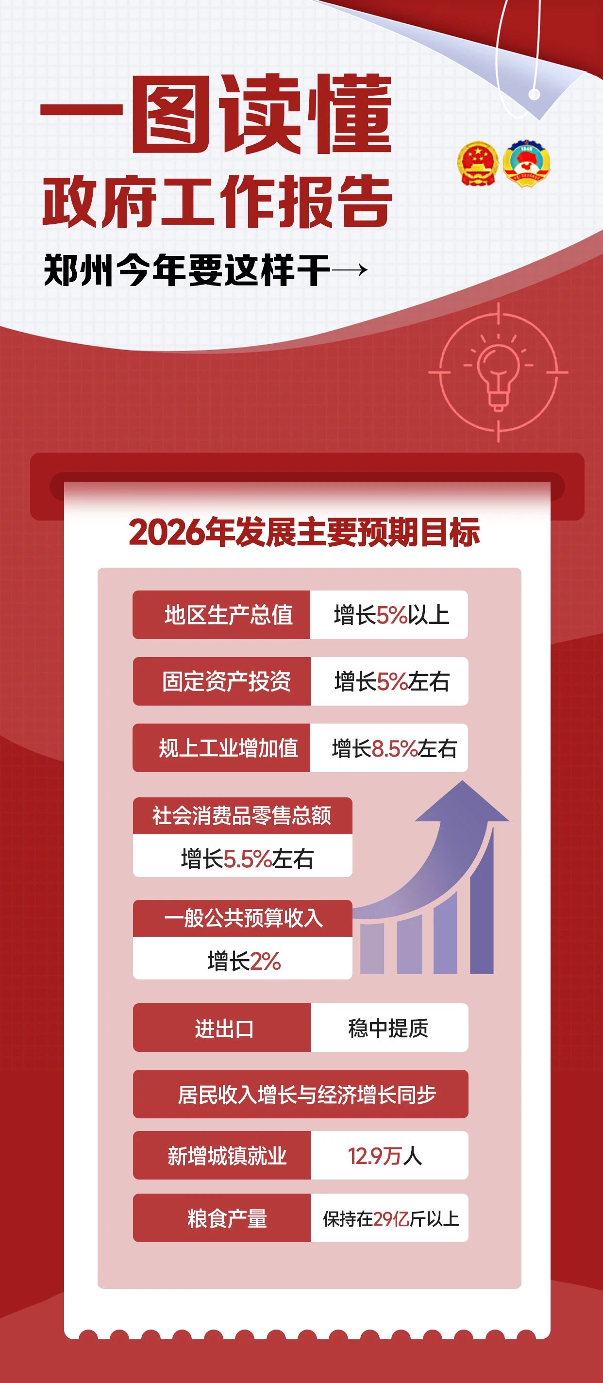 政府工作报告指出,今年是实施“十五五”规划的开局之年,经济社会发展要求高、挑战多、任务重,开局关乎全局。今年经济社会发展的主要预期目标是:地区生产总值增长5%以上,固定资产投资增长5%左右,规上工业增加值增长8.5%左右,社会消费品零售总额增长5.5%左右,一般公共预算收入增长2%,进出口稳中提质,居民收入增长与经济增长同步。